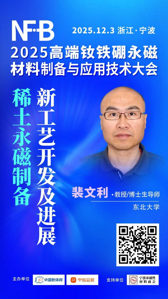 2025平/span>12朇/span>3日,中国粉体网将?/span>浙江·宁波举办‛/span>2025高端钕铁硼永磁材料制备与应用技术大伙/span>”。届时,我们邀请到东北大学裴文利教掇/span>出席本次大会并作题为〉/span>稀土永磁制备新工艺开发及进展》的报告+/span>裴文利教掇/span>将为您介绍东北大学在稀土永磁材料制备中的创新技术、/span>