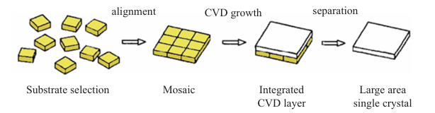 目前制备大尺寸单晶金刚石的技术主要有反复生长法、异质外延法和马赛克拼接法。马赛克拼接法是精选厚度一致、晶向取向一致、方形的优质小金刚石单晶片作为籽晶,并拼接成面积较大的单晶金刚石衬底,其中,必须保证种晶接触位置的晶向要尽可能完美匹配,然后在较大的单晶金刚石衬底上同质外延生长单晶金刚石,最后得到大面积单晶金刚石。由于合成的单晶衬底缺陷与位错密度小,因此马赛克拼接法是目前研究合成英寸级单晶金刚石最优的技术、/p>