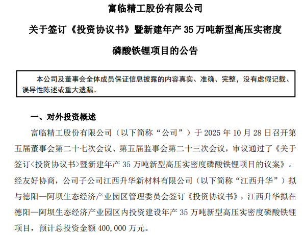 10?9日,富临精工发布公告称,子公司江西升华拟与德阳—阿坝生态经济产业园区管理委员会签订《投资协议书》,江西升华拟在德阳—阿坝生态经济产业园区内投资建设年产35万吨新型高压实密度磷酸铁锂项目,预计总投资金?0亿元、/p>