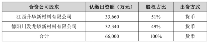 并且,川发龙蟒与富临精工拟共同出资设立合资公司富临龙蟒新材料有限公司,合资公司设立时的注册资本金为人民币66,000万元,其中,江西升华出资33,660万元,占合资公司注册资本?1%,德阳川发龙蟒出?2,340万元,占合资公司注册资本?9%;并以合资公司为主体开?7.5万吨/年高压实磷酸铁锂项目的投资、建设和运营,本项目预计总投资金?9.61亿元,资金来源为合资公司自有及自筹、/p>