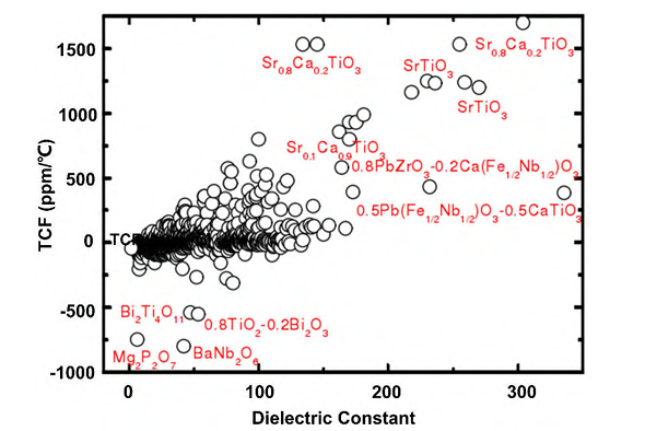 西安交大周迪教授等人在Harrop和Wersing等人的基础上进一步总结了微波介质陶瓷中谐振频率温度系数与介电常数之间的关系。从图中可以看出,虽然没有表现出很明显的规律性,但整体上来说,介电常数高的材料普遍表现出较大的正谐振频率温度系数,只有低介电常数的材料才更可能具有负的谐振频率温度系?/strong>、/p>