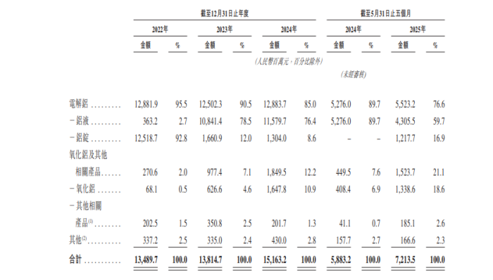 公司在满足电解铝冶炼过程对氧化铝内部需求后将氧化铝作为主要产品之一对外出售?025??1日止五个月,公司氧化铝及其他相关产品产生的收入为人民?,523.7百万元,占同期总收入增?1.1%、/strong>