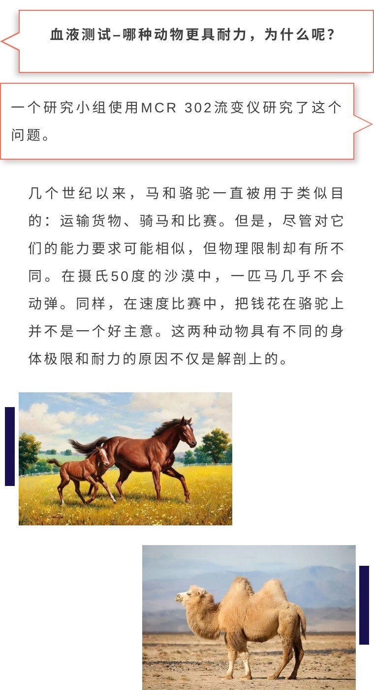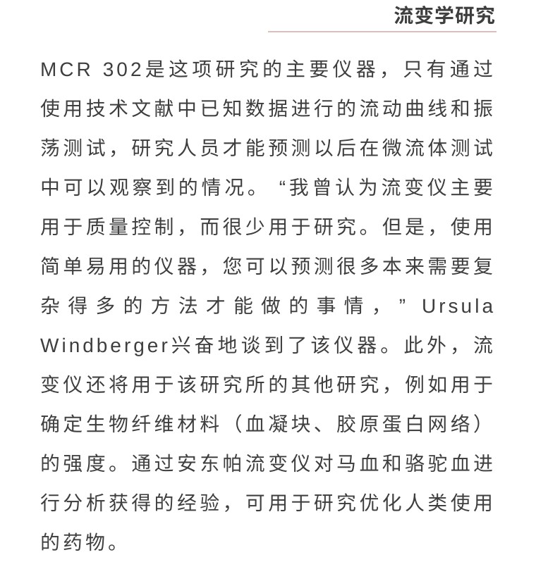 乌苏拉·温德伯格(Ursula Windberger)是维也纳医科大学的实验外科教授,确切地说在血液方面有深入研究。她与她的研究小组一起,使用安东帕(Anton Paar)的MCR 302流变仪,研究了迪拜骆驼繁殖场的十只单峰骆驼和维也纳的十匹纯种马的血液。她取得了惊人的结果,并发现了有趣的差异、/p>