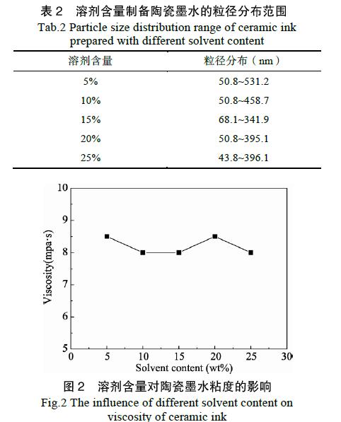 选择1#转子,转?0 r/min,测试其在室温下?5 ℃)的粘度值,如图2 所示。从? 看到,随着溶剂含量的增加,陶瓷墨水的粘度值在8.0mPa·s-8.5 mPa·s 之间变动,符合水性陶瓷墨水的粘度范围。溶剂含量的增加一定程度上不会改善研磨效果,但是会有利于分散助剂的溶解,达到快速溶解的目的。因此,溶剂含量对水性陶瓷墨水的粘度几乎没有影响。但是,溶剂含量对于分散剂和分散助剂的溶解具有关键影响。在制备喷墨打印用的陶瓷墨水时,利用添加一定量的醇类,可以显著改善喷嘴阻塞问题。本实验添加的二乘br data-filtered="filtered" style="margin: 0px; border: 0px; padding: 0px;"/>二醇作为保湿剂,因为保湿剂的加入,不仅能够防止陶瓷墨水在使用过程中造成墨水成分的改变,从而使体系不稳定,而且还使陶瓷墨水的粘度难以随温度的变化而变化。促使在打印喷嘴处形成液体薄膜,以便在下次打印时容易溶解,不发生喷嘴堵塞、br data-filtered="filtered" style="margin: 0px; border: 0px; padding: 0px;"/>2.4分散剂陶瓷墨水粒度的影响