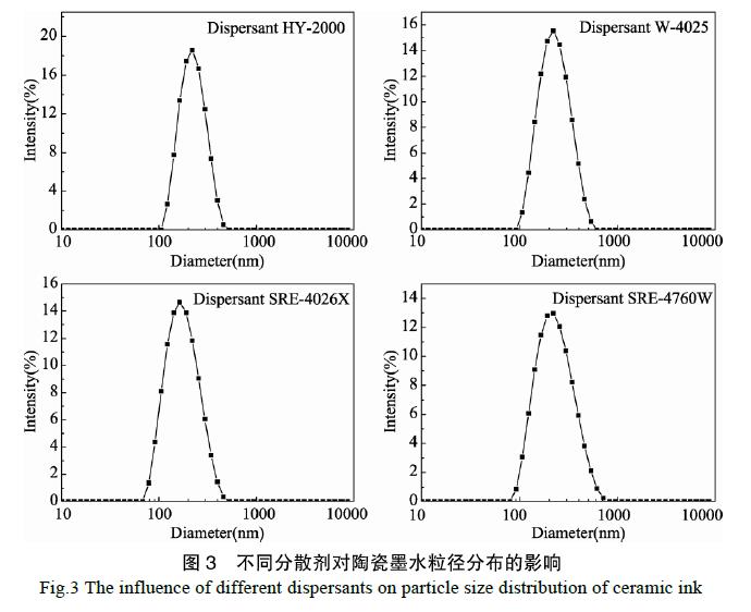 分散剂是影响陶瓷墨水稳定性的主要因素,因此选择合适的分散剂是决定陶瓷墨水性能的关键因素、br data-filtered="filtered" style="margin: 0px; border: 0px; padding: 0px;"/>本文选择丙二醇和二乙二醇用作主要溶剂,并使用相同比例的配方。分散剂以北京麦尔化工科技有限公司生产的分散剂HY-2000、侗富贵化工原材料有限公司生产的分散剂SRE-4026X、SRE-4760W 和鸿昶新材料有限公司生产的分散剂W-4025 作为单一变量制备四组陶瓷墨水。图3 为分散剂对陶瓷墨水粒径的影响。在其他参数不变的情况下,添加分散剂SRE-4026X 制备的陶瓷墨水平均粒?**小,达到164 nm,粒径分布范?**窄,***粒径?00 nm。如果分散剂溶剂化链在分散介质中溶解性较好,但由于溶解在介质中的溶剂化链长度太短,形成的吸附层厚度受到限制。因此,空间位阻不能使分散体系达到稳定。所以,选择合适的分散剂对于墨水的制备具有重要影响、br data-filtered="filtered" style="margin: 0px; border: 0px; padding: 0px;"/>