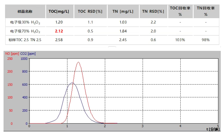 对电子级分别?0%?0%双氧水溶液进行直接测定,70%双氧氳span class="" style="--tw-border-spacing-x: 0; --tw-border-spacing-y: 0; --tw-translate-x: 0; --tw-translate-y: 0; --tw-rotate: 0; --tw-skew-x: 0; --tw-skew-y: 0; --tw-scale-x: 1; --tw-scale-y: 1; --tw-pan-x: ; --tw-pan-y: ; --tw-pinch-zoom: ; --tw-scroll-snap-strictness: proximity; --tw-gradient-from-position: ; --tw-gradient-via-position: ; --tw-gradient-to-position: ; --tw-ordinal: ; --tw-slashed-zero: ; --tw-numeric-figure: ; --tw-numeric-spacing: ; --tw-numeric-fraction: ; --tw-ring-inset: ; --tw-ring-offset-width: 0px; --tw-ring-offset-color: #fff; --tw-ring-color: rgb(59 130 246 / 0.5); --tw-ring-offset-shadow: 0 0 #0000; --tw-ring-shadow: 0 0 #0000; --tw-shadow: 0 0 #0000; --tw-shadow-colored: 0 0 #0000; --tw-blur: ; --tw-brightness: ; --tw-contrast: ; --tw-grayscale: ; --tw-hue-rotate: ; --tw-invert: ; --tw-saturate: ; --tw-sepia: ; --tw-drop-shadow: ; --tw-backdrop-blur: ; --tw-backdrop-brightness: ; --tw-backdrop-contrast: ; --tw-backdrop-grayscale: ; --tw-backdrop-hue-rotate: ; --tw-backdrop-invert: ; --tw-backdrop-opacity: ; --tw-backdrop-saturate: ; --tw-backdrop-sepia: ; --tw-contain-size: ; --tw-contain-layout: ; --tw-contain-paint: ; --tw-contain-style: ; box-sizing: border-box; border-width: 0px; border-style: solid; border-color: rgb(229, 231, 235);">RSD达到0.5%,说明VITA流量技术很好地消除了燃烧过程中气流波动带来的影响,测试样品后对2.5ppm的标液进行回测,回收率为103%,说明仪器的氧化性能佳;且仪器能兼顾TN的同时测试,为品控提供有力的数据支持、/p>