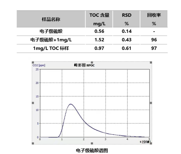 由于氨水是碱性溶液且电子级的氨水TOC浓度本身就比较低,容易吸收空气中的CO2,造成结果的不准确性,测试前对样品进行稀释中和,同时扣除酸空白。从实验数据可以看出,样品RSD均小?%?.1ppm的样品加标回收率?9%?.1ppm TOC标样的回收率?02%,说明仪器对低TOC的电子级氨水测定准确性高、/p>