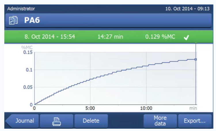 使用HX204测定PA6塑料粒子的水分含量结果为0.129%,符合加工工艺中建议的最大极限?.2% 因此,无需再对塑料粒子进行干燥,即可启动注塑工艺、/p>