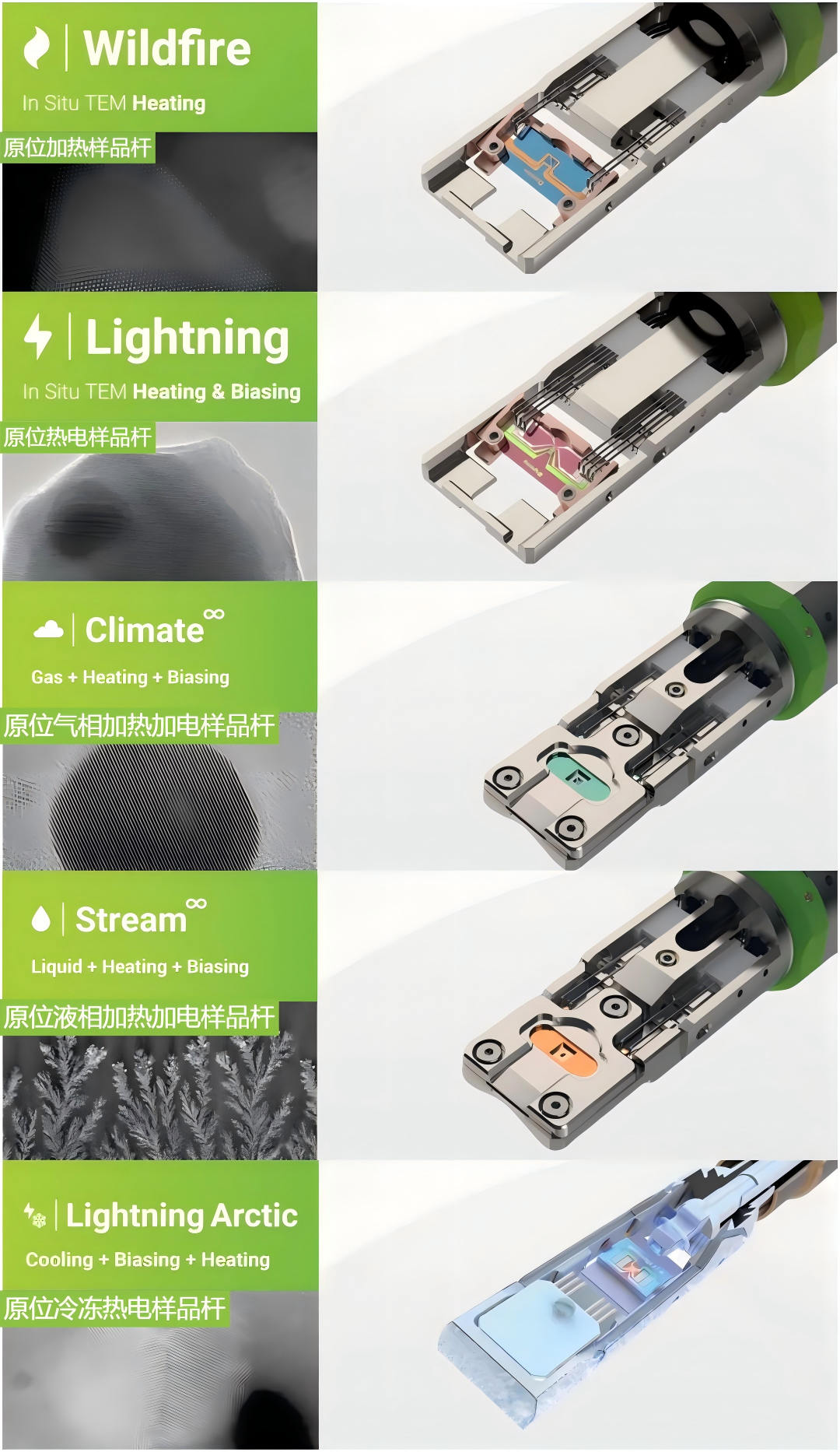 DENSsolutions 产品可以为原 TEM 样品施加外界刺激,捕 TEM 样品在真实环境下的动态现象。目前提供的四种原位实验方案:Wildfire TEM 原位加热方案、Lightning TEM 原位热电方案、Arctic TEM 原位低温冷冻热电方案、Climate Infinity TEM 原位气相加热加电方案 Stream Infinity TEM 原位液相加热加电方案,为各学科领域在相关条件下研究各种材料和工艺开辟了前所未有的可能性、/p>