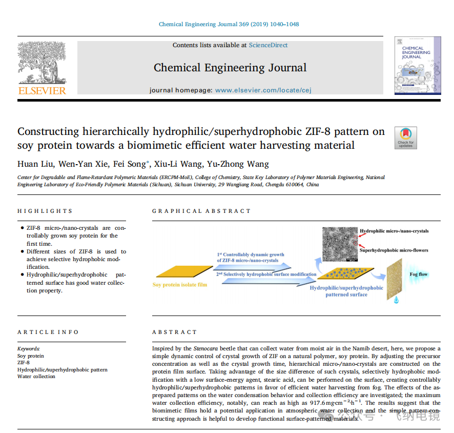 Constructing hierarchically hydrophilic/superhydrophobic ZIF-8 pattern on soy protein towards a biomimetic efficient water harvesting material(在大豆蛋白上构建层次化的亲?超疏水ZIF-8图案,以制备仿生高效集水材料(/p>