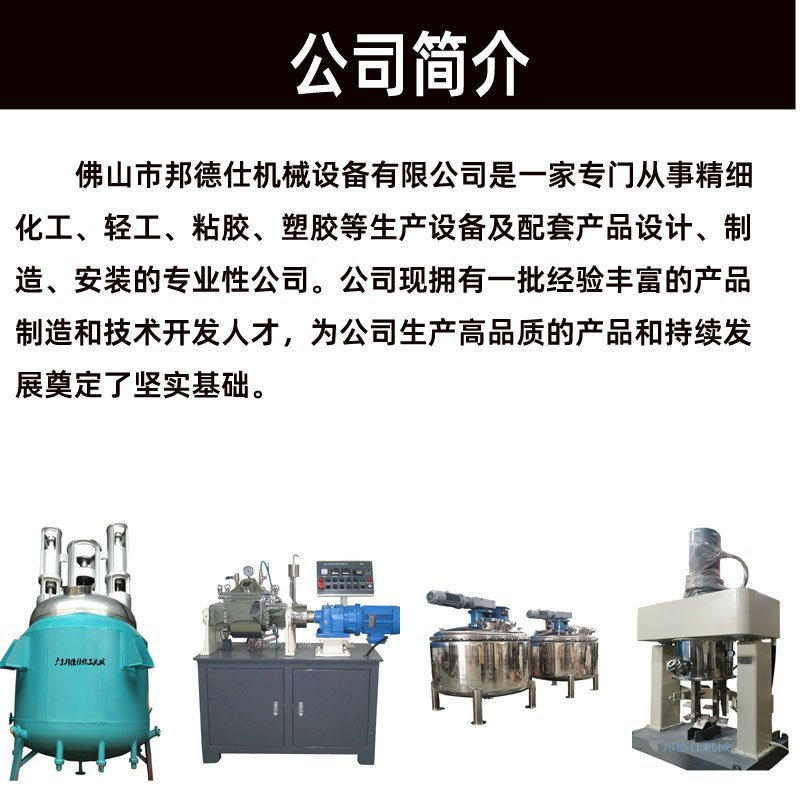 佛山市邦德仕机械设备有限公司处珠三角**,城市经济,商贸,技术高速发展的大都?-佛山市,交通与通讯相当便利。专业生?锂电池负极材料包覆设备,改性石墨材料设?动力混合?捏合?强力分散?高速分散机,行星搅拌机,化工机械,化工成套设备,反应釜,行星动力混合?粉体混合?玻璃胶设?硅胶设备,密封胶设?灌封胶设?硅酮胶设?胶水设备,PU胶设?聚氨酯设?白乳胶设?TPU设备,阻燃剂设?热熔胶设?跑道胶设?硅PU),干挂胶设备等。是一家专门从事精细化工、轻工、粘胶、塑胶等生产设备及配套产品设计、制造、安装的专业性公司