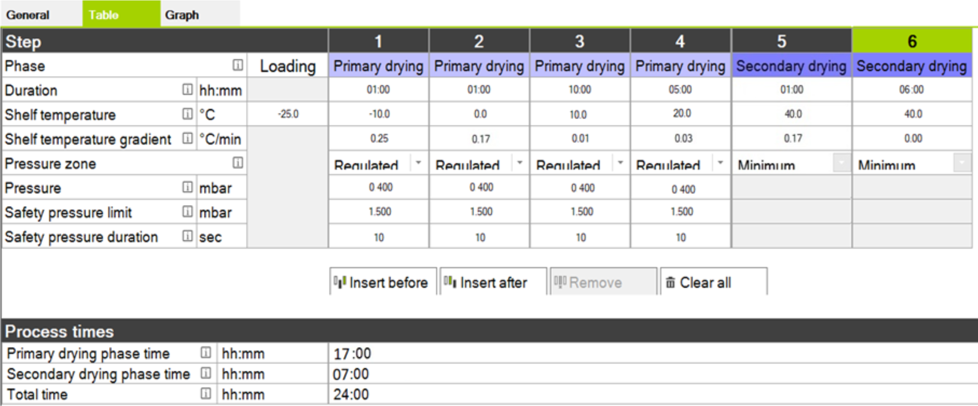 冷冻干燥过程是在装载步骤开始的,需要设置隔板温度,例如 -25°C,因为样品在冷冻柜中冻结。通过将隔板保持在与样品相同的温度,可以最大限度地减少由于传热而导致的样品熔化,并且可以确保均匀干燥。在干燥过程中,隔板温度 -10°C 逐渐升高 40°C,以方便样品中水的升华。为了保持最佳升华效率和防止样品坍塌,在整个初级干燥过程中,压力保持 0.300mabr 的恒定水平、/p>