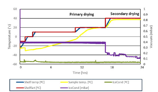 ?描述了冷冻干燥循环的过程。完 17 小时后,样品温度达到 20 的隔板温?/strong>。这种收敛是一个重要的迹象+span style="color: rgb(86, 172, 221); box-sizing: border-box;">表明初级干燥阶段已经结束。在初级干燥阶段,通过升华从样品中除去大量的水,这需要大量的能量。过渡到二次干燥阶段开始于 18 小时。在二次干燥阶段,通过去除结合水分来干燥样品。这种水的量相当低,因此样品遵循设定的隔板温度很快、/p>