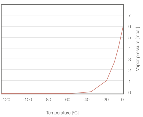 当温度降低时,蒸汽压迅速下降,达到速率平台期。当压力和温度一起绘制成图表时,可以明显观察到这种影?下图):该图为冰的温度与其蒸气压的关系、/p>