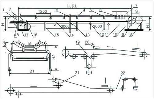 、传动滚筒;2、头罩;3、输送带?、槽型调心托辊;5、槽型托辊;6、缓冲托辊;7、导料槽?、螺旋拉紧装置;9、改向滚筒;10、尾架;11、空段清扫器?2、下平调心托辊;13、下托辊?4、中间架?5、中间支腿;16、改向滚筒;17、头架;18、弹簧清扫器?9、垂直拉紧装置;20、犁式卸料器?1、卸料车?2、车式拉紧装?/strong>