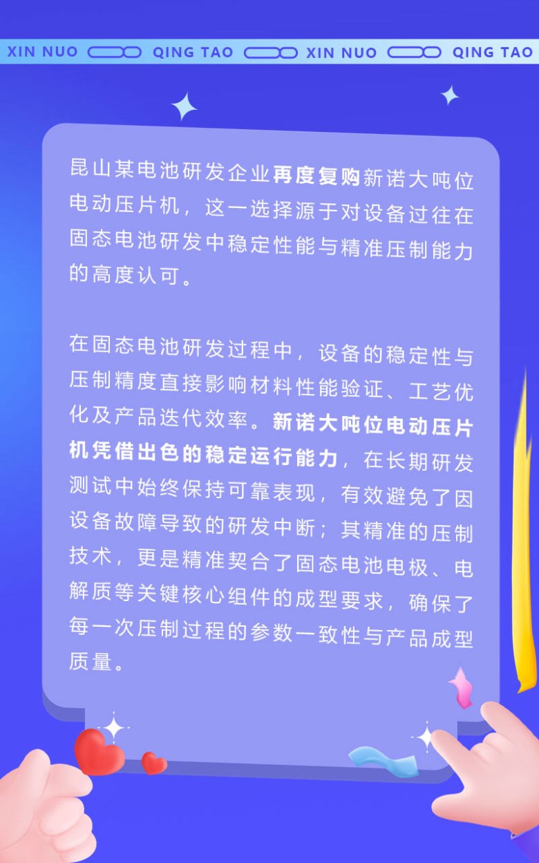 昆山某电池研发企业再度复购新诺大吨位电动压片机,这一选择源于对设备过往在固态电池研发中稳定性能与精准压制能力的高度认可。在固态电池研发过程中,设备的稳定性与压制精度直接影响材料性能验证、工艺优化及产品迭代效率。新诺大吨位电动压片机凭借出色的稳定运行能力,在长期研发测试中始终保持可靠表现,有效避免了因设备故障导致的研发中断;其精准的压制技术,更是精准契合了固态电池电极、电解质等关键核心组件的成型要求,确保了每一次压制过程的参数一致性与产品成型质量、/span>