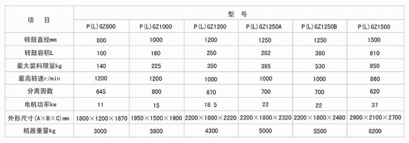 P(L)GZ型离心机适合分离含固相物粒度大于0.01mm的悬浮液,电动机带动转鼓旋转,在进料转速时,物料由进料管引入转鼓旋转,进料达到预定容积后停止进料,升至高速分离,在离心力的作用下,液相物穿过滤布和转鼓壁滤孔排除转鼓,经排液管排出机外,固相物截留在转鼓内,分离完毕转速至卸料转速状态,刮刀自动升降、旋转往复运行,将固相物从转鼓刮下,从离心机下部卸出