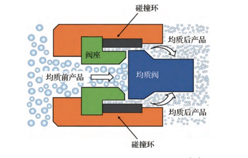 高压均质机的工作原理如上图所示,尽管高压是均质机的驱动力,但主要工作在均质阀上。高压均质是利用柱塞泵为动力传递和输送液体物料的管道,柱塞泵吸入液体物料后并对液体物料加压,在柱塞作用下液体物料以高压低流速的状态进入压力可调节的均质阀中,液体物料在高压的作用下迅速通过特定宽度的均质阀缝隙,瞬间失压的液体物料以极高的流速(1000?500m/s)碰撞在撞击环上,产生了剪切、空穴和撞击等机械力作用,最终使得物料粉碎细化及分散、/p>