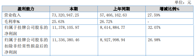 2023年上半年公司实现营业收入73,320,947.25元,比上年同期增?7.59%;归属于挂牌公司股东的净利润11,378,105.97元,比上年同期增?2.07%;归属于挂牌公司股东的扣除非经常性损益后的净利润11,336,380.46元,比上年同期增?6.98%、/p>