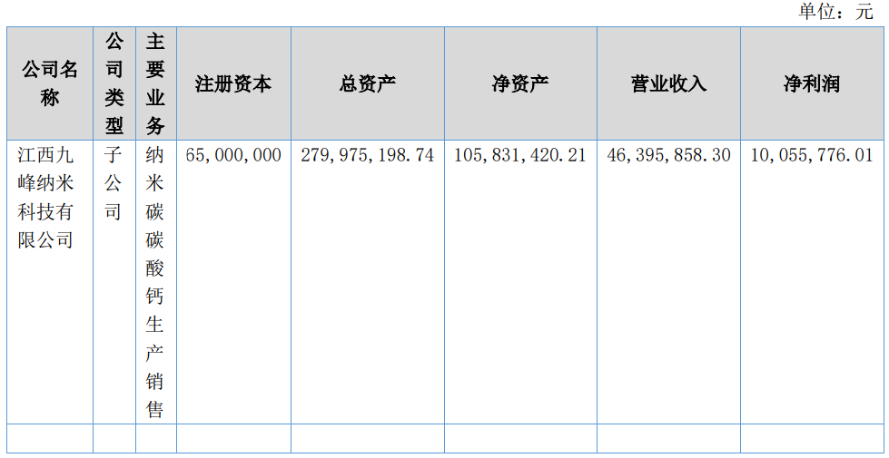 ?)浙江天一新材料有限公司:注册资本500万元,公司持股比?00%,主营业务为无机盐类新材料、有机化学新材料的销售及机关技术咨询服务;人力资源装卸搬运;纳米钙预聚体的生产及销售。本期净利润?.84万元、/p>