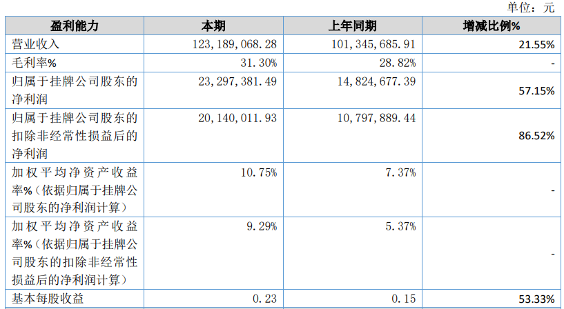 2023年上半年公司实现营业收入12,318.91万元,比上年同期增长21.55%;归属于挂牌公司股东的净利润23,297,381.49元,比上年同期增?7.15%;归属于挂牌公司股东的扣除非经常性损益后的净利润20,140,011.93元,比上年同期增?6.52%、/p>