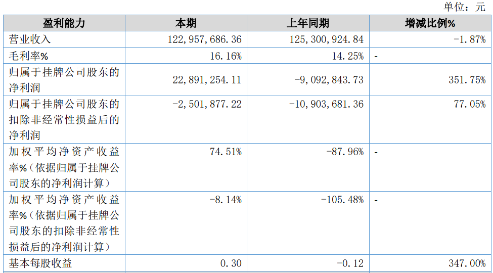 2023年上半年公司实现营业收入122,957,686.36元,比上年同期减?.87%;归属于挂牌公司股东的净利润22,891,254.11元,比上年同期增?51.75%;归属于挂牌公司股东的扣除非经常性损益后的净利润-2,501,877.22元,比上年同期增?7.05%、/p>