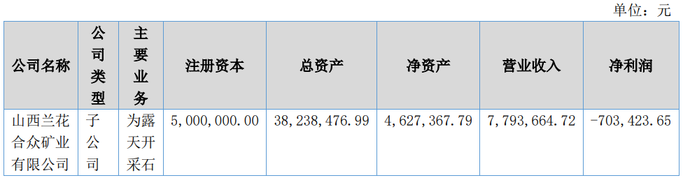 负责露天开采石业务的山西兰花合众矿业有限公司,本期实现营业收入7,793,664.72元,净利润-703,423.65元、/p>