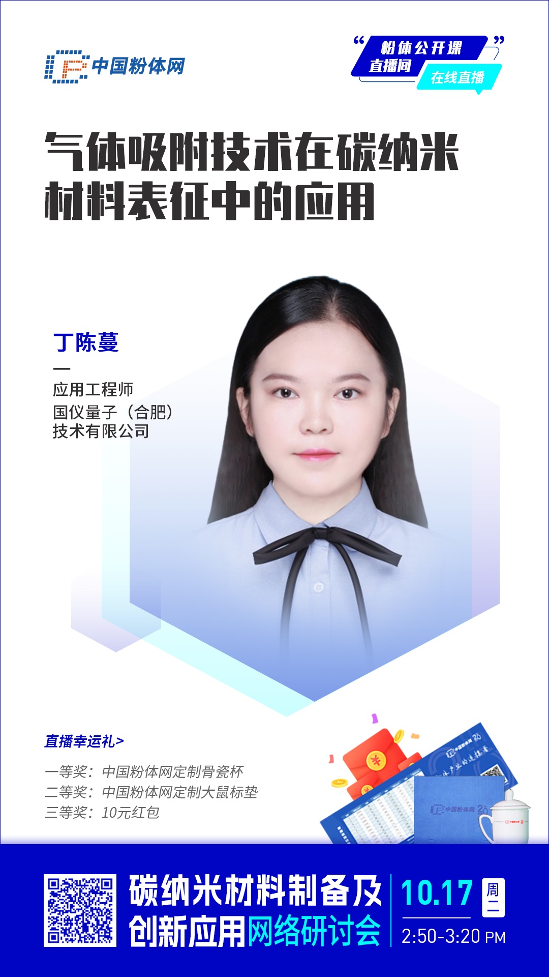 嘉宾介绍9/span>丁陈蔓,毕业于南京农业大学资源与环境科学学院,研究方向为光催化材料的研制、表征与应用,现任国仪量子(合肥)技术有限公司应用工程师,从事国仪精测业务相关领域高新技术应用开发及技术支持工作,在气体吸附技术应用领域横跨催化、环保、新能源和储氢等。工作中紧密接触一线科研工作者,扎实理论基础,拓展行业应用方向;同时国仪精测业务研发团队在精密测量领域技术沉淀已有16年,可为该领域的用户提供更全面、更专业的技术服务和整体解决方案、/span>