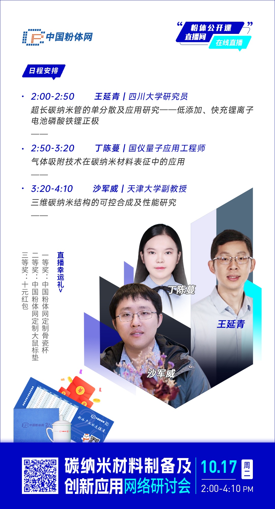 为进一步探讨碳纳米管、石墨烯等碳纳米材料的制备工艺、应用研究及产业化前景。粉体公开课平台于10?7日举办?023碳纳米材料制备及创新应用网络研讨会”,进行交流、研讨、/span>