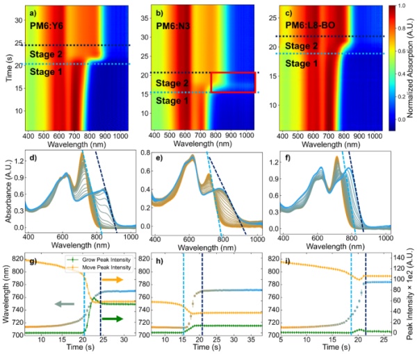 ??#8194;原位光谱表征结果。(a-c)原位光谱瀑布图;(d-f)光谱叠图;(g-i)生长-移动模型拟合光谱演化结果、/p>