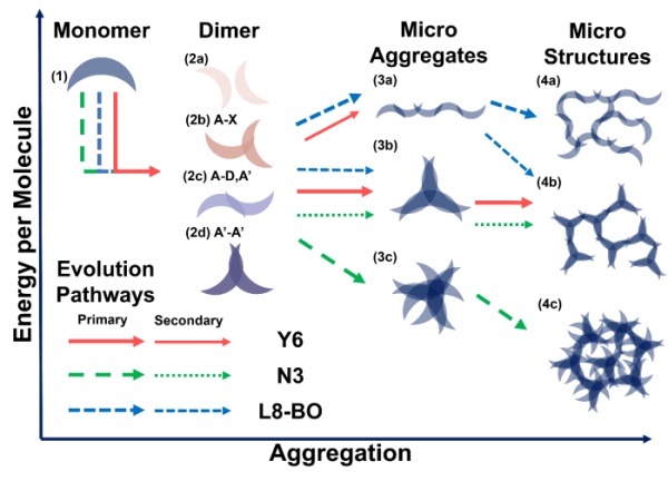 为了探究分子结构在大面积有机光伏器件制备的成膜动力学中的影响,该团队选择了三个烷基链存在细微区别的Y系列同系物分子(Y6、N3、L8-BO)与PM6共混,采用狭缝涂布法制备大面积有机光伏器件。该工作采用原位吸收光谱、原子力显微镜及掠入射广角X射线散射,并结合分子动力学模拟的结果解析成膜动力学机制。原位光谱表征表明三种结构相似的受体分子在成膜时吸收光谱演化趋势存在显著差异,呈现出“生长”和“移动”的二元模式(图1)。后续的多尺度结构分析表明,三种不同的分子呈现出不同的聚集形态特征,且分子堆积模式存在明显区别。从分子动力学中提取出的星型三聚体及其进一步组装形成的聚集体,其特征能够同时体现“生长”模式的吸收光谱演化以及符合掠入射广角X射线散射结果。基于以上实验和模拟结果,该研究提出了聚集控制的大面积有机光伏器件制备成膜动力学(图2)。动力学模型提出,分子烷基链与主骨架相互竞争导致分子聚集类型的变化,进而逐层级地决定有机光伏器件的活性层形貌及器件性能。聚集态的分布由分子结构本征决定,但可通过浓度、溶液温度和给体-受体分子的相互作用进行调制,为有机光伏材料的分子设计及加工工艺调整提供了重要参考、/p>