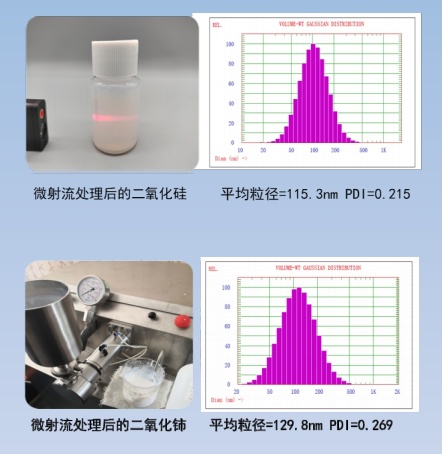 在CMP抛光液中的应用中,纳米磨料颗粒存在比表面积大、表面原子数多、表面能高等问题使其在水相介质中极易发生粒子团聚和快速沉降,导致抛光过程中表面粗糙度增加、划伤增多及抛光效率不稳定。通过迈克?#174;微射高压均质机分散可以有效地将二氧化硅,二氧化铈等氧化物均匀分散到纳米级,有效解决抛光液纳米分散中团聚的痛点、/p>