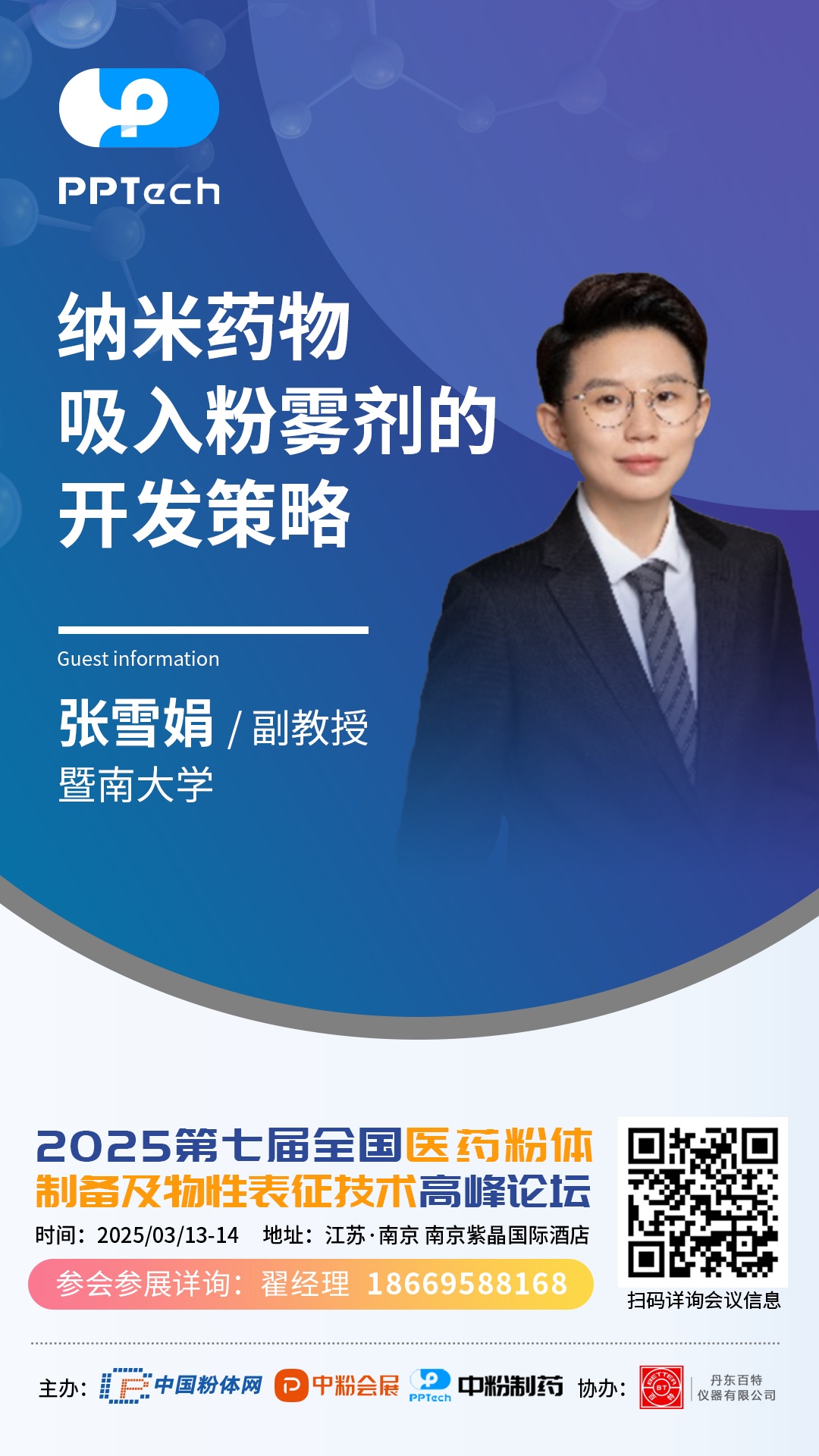 以“从粉体技术,论制药工艺”为主题+strong>2025??3-14?/strong>中国粉体网将?strong>江苏南京紫晶国际酒店举办‛span style="color: rgb(255, 0, 0);">2025第七届全国医药粉体制备及物性表征技术高峰论坚/strong>”。届时来?strong>暨南大学张雪娞/span>副教授将为大家带来〉span style="color: rgb(255, 0, 0);">纳米药物吸入粉雾剂的开发策?/strong>》的主题报告。报告主讲人将着重介绍纳米药物吸入粉雾剂开发的多种策略,为纳米药物吸入粉雾剂的定向开发提供理论依据与实践指导、/p>