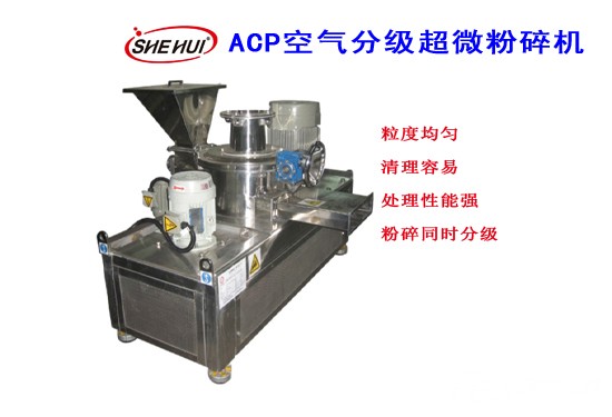 ACP系列空气分级粉碎机为协宏机械拳头产品,已通过TUV认证,具有有效粉碎的同时,还可加以分级;制品粒度均匀;粒度调整容易;具备安全装置;清理容易处理性能强等特点。