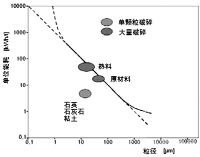 理论表明,工业破碎的能效比单个颗粒破碎的能效不止低一个数量级(图1)。这是建立在整个粉磨系统的生产需求基础上的,当然不允许单颗粒破碎。