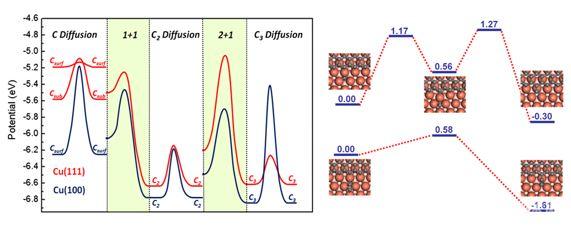 利用化学气相沉积法在铜衬底上外延生 长石墨烯是目前广泛采用的一种生长大面积、高质量单层石墨烯的方法。石墨烯样品的质量取决于一些关键的生长参数,包括生长温度、蒸气压、衬底形态和碳源等。揭示石墨烯外延生长的原子尺度机理,特别是其中各种动力学过程的相对重要性,对实现石墨烯非平衡生长的精确控制十分关键。不同的铜衬底中,因为(111)表面的几何结构与石墨烯相似,而(100)表面在铜箔中分布最多,所以这两种表面在石墨烯生长中广受关注。实验研究表明,在铜(111)表面石墨烯生长是扩散限制的,而在铜(100)表面是贴附限制的。当石墨烯岛足够大的时候,不同表面形成支链状或树枝状的分维形态还是形成密集形态的行为也不一样。迄今为止,对于这两种衬底上差异明显的生长行为的原子机理的理解仍然欠缺。甚至石墨烯成核生长过程中最基本的供给单元是碳单体,还是更大的碳聚合体,仍然没有明确的结论。