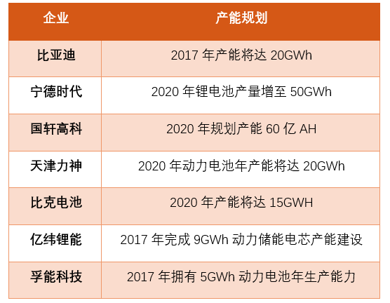2016年,很多公司都在扩张动力锂离子电池产能。截止2016年底,市场上有较大影响力的10家主流动力电池厂商的动力锂电合计产能已接近50GWh,预计2017年将超过85GWh,这其中还不包括众多中小规模的制造商。但根据预测,2017年我国动力电池总需求量或不足35GWh。由此可见,动力电池市场未来将出现产能过剩的情况。