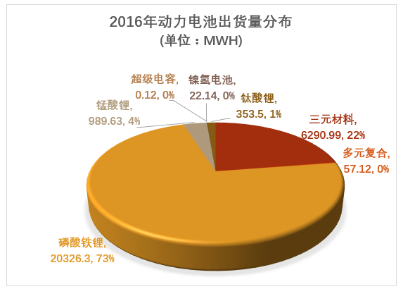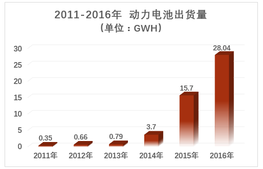 从上图可知,动力电池的发展紧随新能源汽车整体市场趋势,新能源汽车市场开始大幅上量后,动力电池市场也呈现爆发趋势。从2014年的3.70Gwh的出货量跃居至2015年15.7Gwh,同比增长超过3倍。2016年,新能源汽车搭载电池总量达28 Gwh,与去年同期相比增长79%,超过去年全年动力电池出货量近12Gwh。(注:动力电池出货量为保守统计数据,由于未考虑其他影响因素,电池厂商实际产能会高于此。)