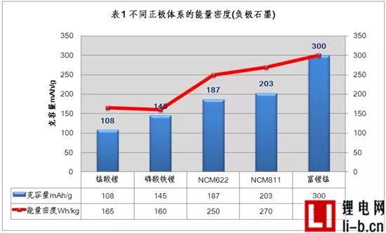 高克容量(200-300mAh/g )和工作电压高(>4.5V),所以具有亮眼的能量密度。富锂锰基材料与当前动力电池主流正极材料的克容量和能量密度对比(表1)。同时Mn元素比例的提高同时减少了Co的含量,降低了材料价格,且对环境友好。