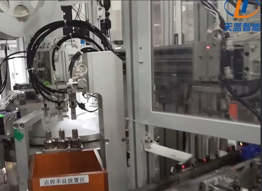 电芯点底焊——既电芯底部极耳与钢壳焊接的过程。天蓝智能的点底焊机,该设备首创2次焊接,采用凸轮连杆传动方式,可实现无间断旋转传送,设备搭载的拉力测试环节,可有效防止不良品流入下一工序。
