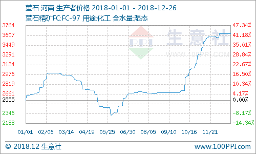 据生意社监测数据显示,2018年国内萤石价格大幅上涨,年初平均价格为2555元/吨,年末国内萤石均价为3633.33万吨,全年涨幅为42.20%。由萤石价格走势图中可以清晰的看出,2018年国内萤石价格最低价出现在5月30日,国内均价为2320元/吨,国内萤石价格最高价出现在年底,均价为3633.33元/吨,全年最大振幅为56.61%,全年市场价格大幅上涨,萤石价格达到历史新高水平。