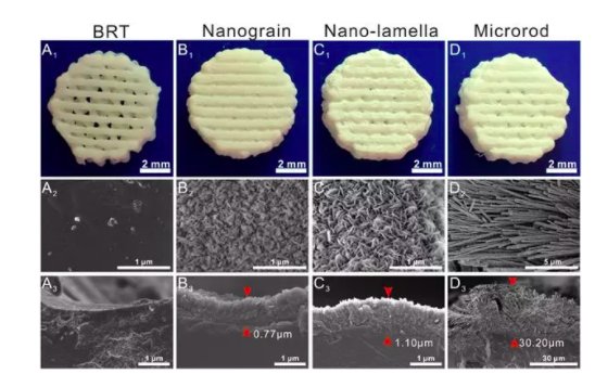 3D打印具有表面微结构的生物陶瓷多孔支架。纯BRT支架与不同表面微结构修饰的复合支架Nanograin,Nano-lamella及Microrod的形貌。