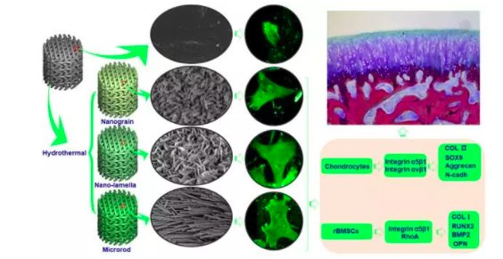 随后,活化的整合素诱导F-Actin重组,并进一步促进软骨特异性基因(SOX9, Aggrecan,COL2及N-cadh)表达,进而促进软骨成熟。生物陶瓷表面微结构除了对软骨细胞有促进作用,同时对骨髓间充质干细胞(rBMSC)的成骨分化也有诱导作用。