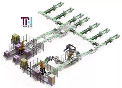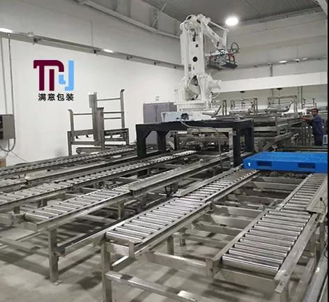 全自动机器人码垛一般包括:倒袋整形输送机、重量复检秤、不合格剔除机、爬坡输送机、棍子整袋输送机、缓停皮带输送机、取袋输送机、自动托盘库、空托盘输送机、码垛输送机、存垛输送机、出垛输送机、机械手码垛机(品牌选配)、输送线控制柜。