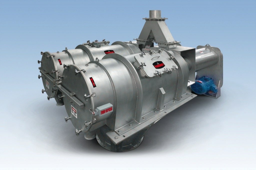 尺寸合适的颗粒通过筛网中的孔并通过锥形滑槽排出,而尺寸过大的颗粒通过手动或自动阀排出到密封的快速释放容器中。每个双筛分室都有一个悬臂轴,在筛分室和电机驱动器之间有两个外部安装的轴承,无需在铰接式端板上安装第三个轴承。