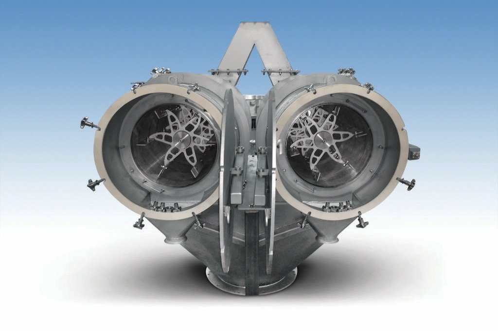 进料分配器将进入的物料流均匀地分入两个平行运作的水平定向圆柱形筛分室。每个筛分室内的轴转动螺旋桨组件,将加速颗粒和软团聚体与筛分室的径向运动。