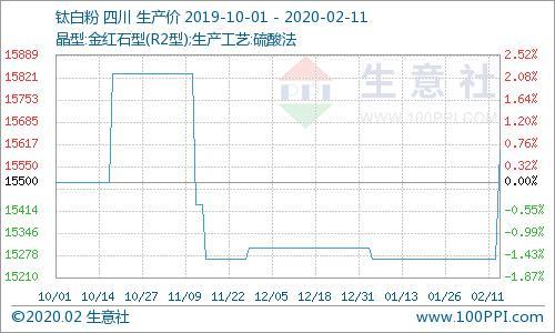 以国内市场走货量较大的硫酸法金红石型钛白粉为例,据生意社大宗榜数据显示,钛白粉行情稳中有涨,从2月3日出厂均价是15266.67元/吨到2月11日出厂均价是15600元/吨,涨幅为2.18%。