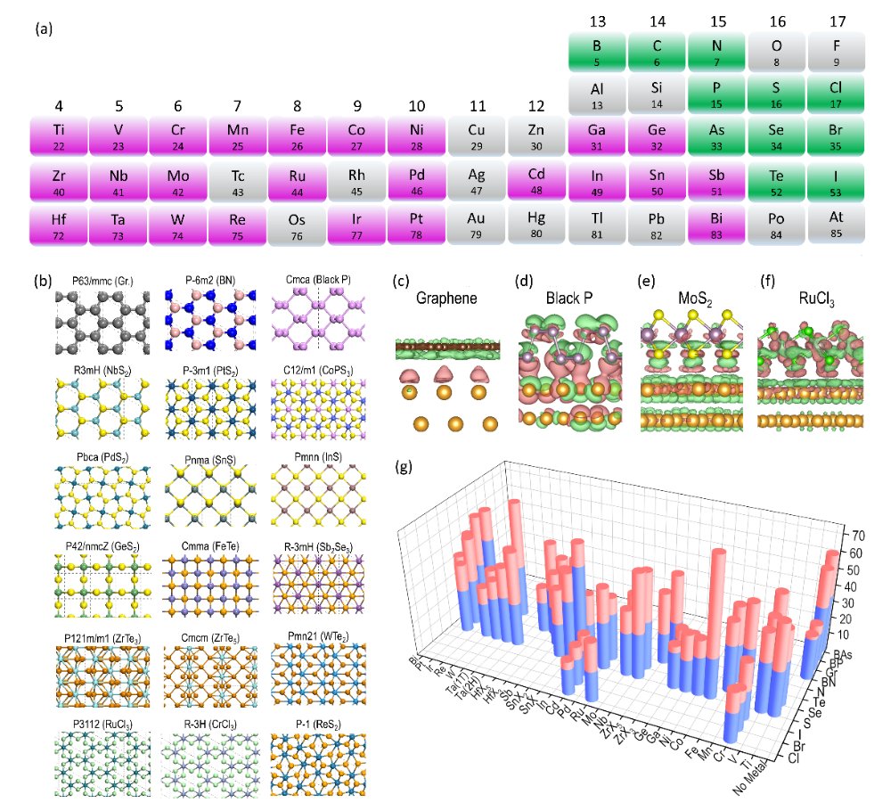 图1. 不同层状材料自身层间结合能以及与金相互作用能的对比。