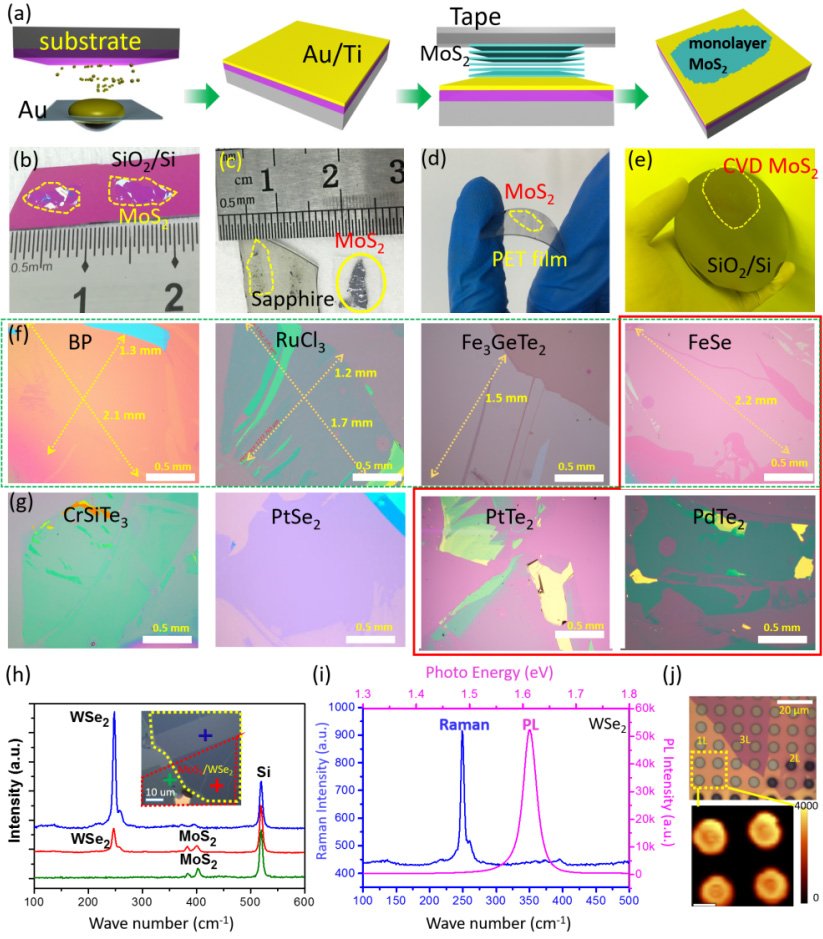 (a) 新型机械解理的步骤; (b-e) 不同基底上解理得到的大面积MoS2;
