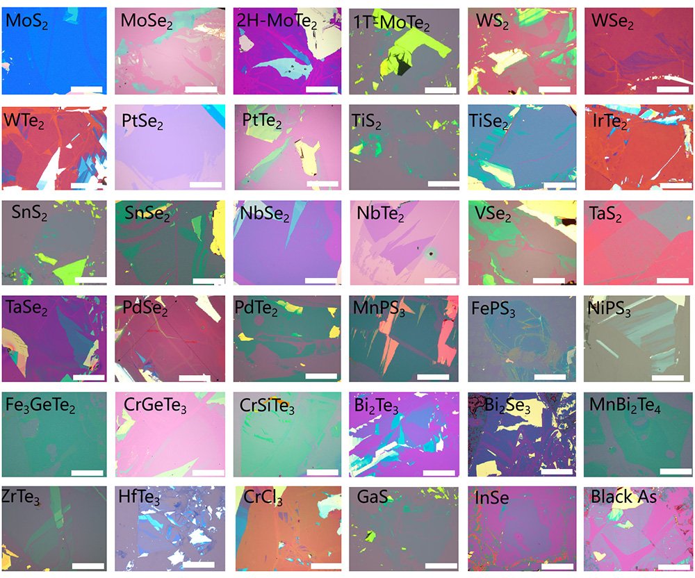 图2. 机械解理获得多种大面积高质量超薄二维材料。